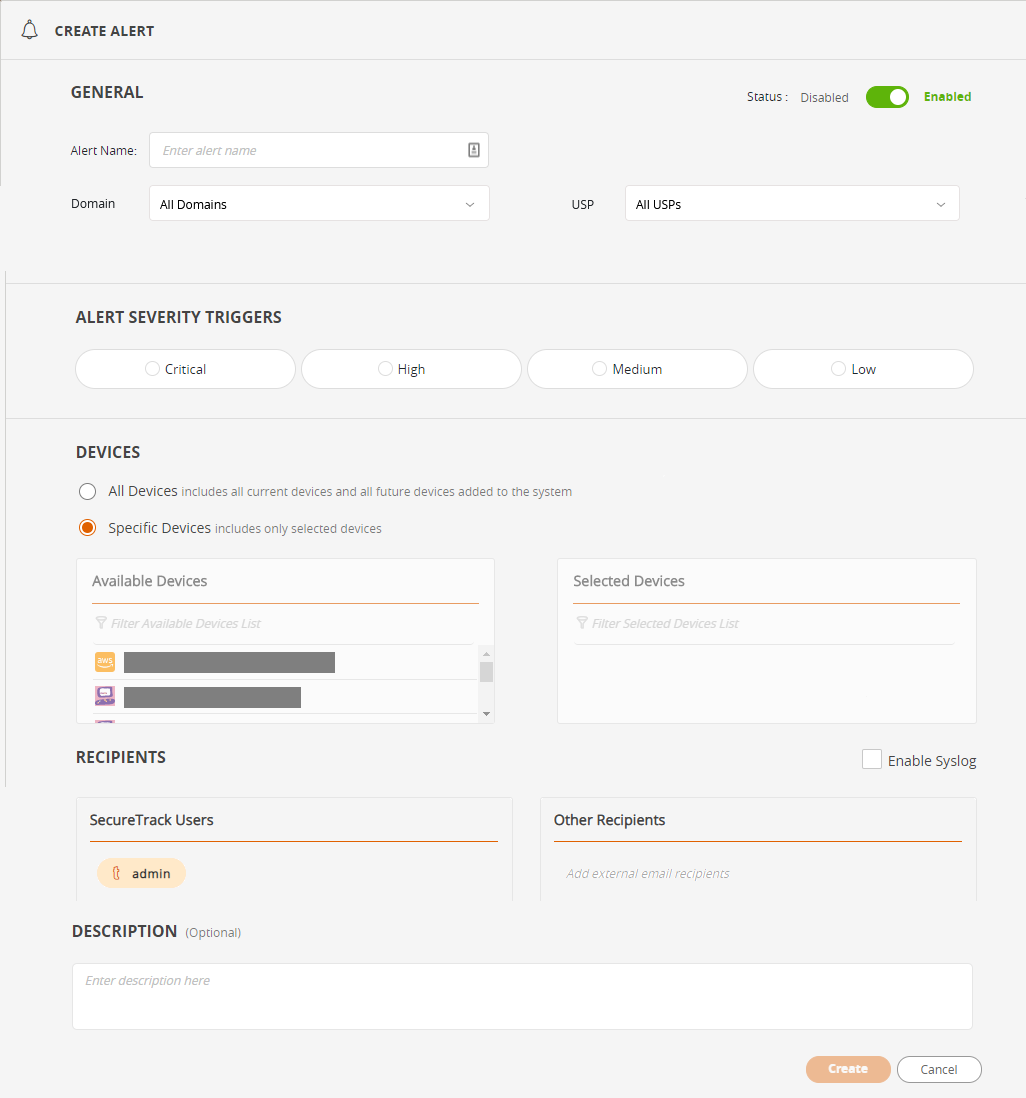 Syslog Select to send alert also to syslog. Recipients - SecureTrack Users The current user is selected by default. Add additional users by starting to type the user name and selecting from the list displayed. To remove, hover over the user name and click X. At least one user must be selected. Recipients - Other Recipients Enter a valid email address and press Enter. Repeat for additional addresses. To remove, hover over the address and click X. Description Free text - Click Save.