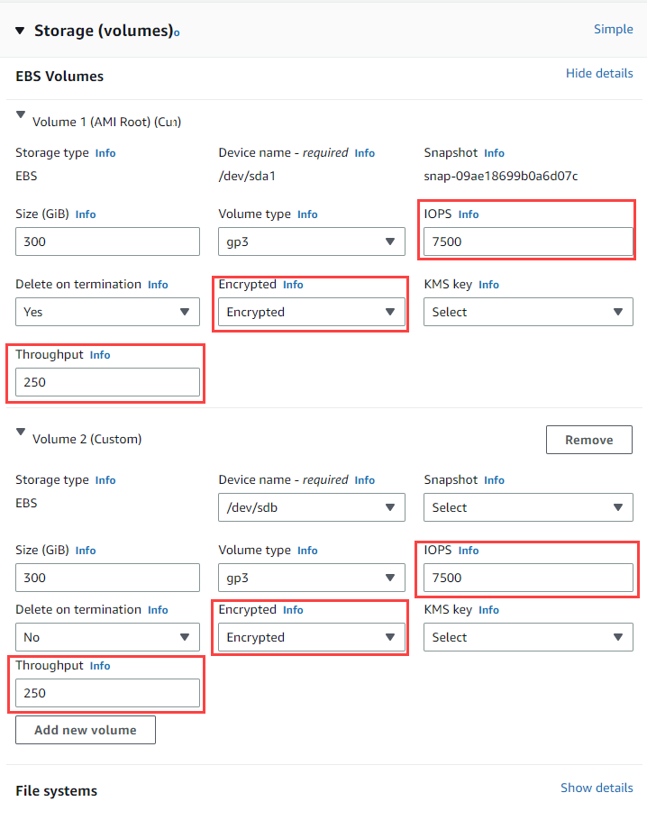3. Click the Advanced link, and set the IOPS, Throughput, and Encryption for each volume. Take into consideration that TOS requires 7,500 IOPS and the throughput expected will average 250MB/s with bursts of up to 700MB/s.