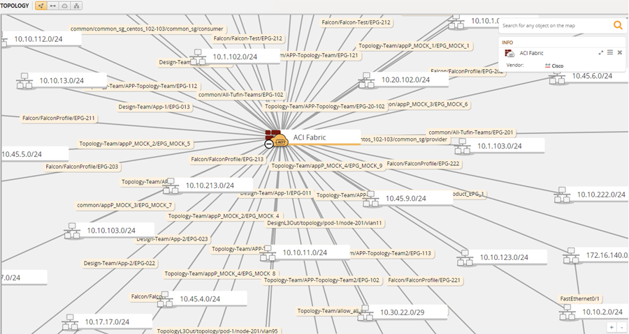 When you search for the ACI device in the Map, the ACI is presented as a single firewall in the Map and displays the aggregated information from the different tenants.