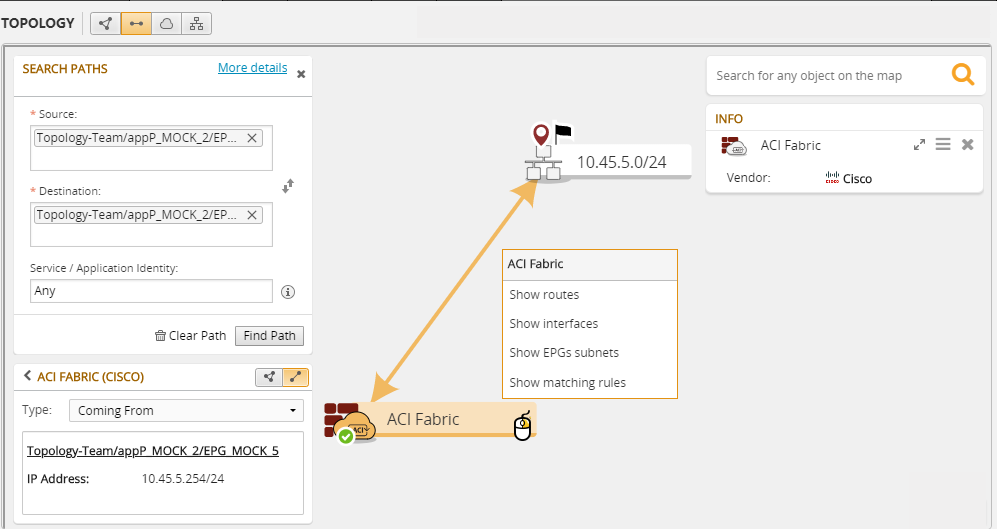 For Cisco ACI devices, Tufin supports path calculations in the Map with security simulations and with service graph calculations. You get to search for paths that cross the ACI fabric on the way from source to destination in Path Analysis. We show you the access rules from the Tufin model that enable, redirects, or denies the traffic that crosses the ACI.