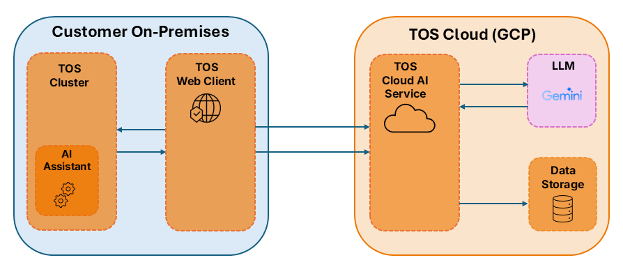 The TOS Cloud AI Service is the central cloud-based component responsible for processing natural language queries. It functions as a secure, isolated service that never communicates directly with the on-premises environment.
