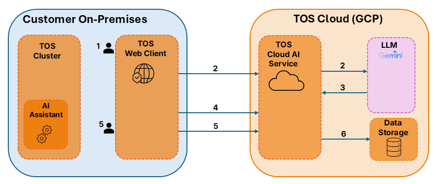 The TOS Web Client securely sends the natural language query to the TOS Cloud AI Service, which forwards it to the LLM for processing.