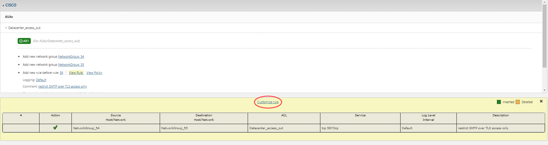 - Rule Modification: Recommends changes to the rule base, such as updating the source, destination, or service.