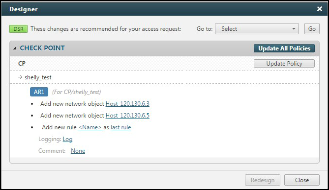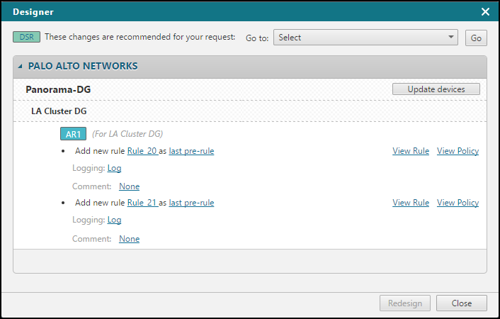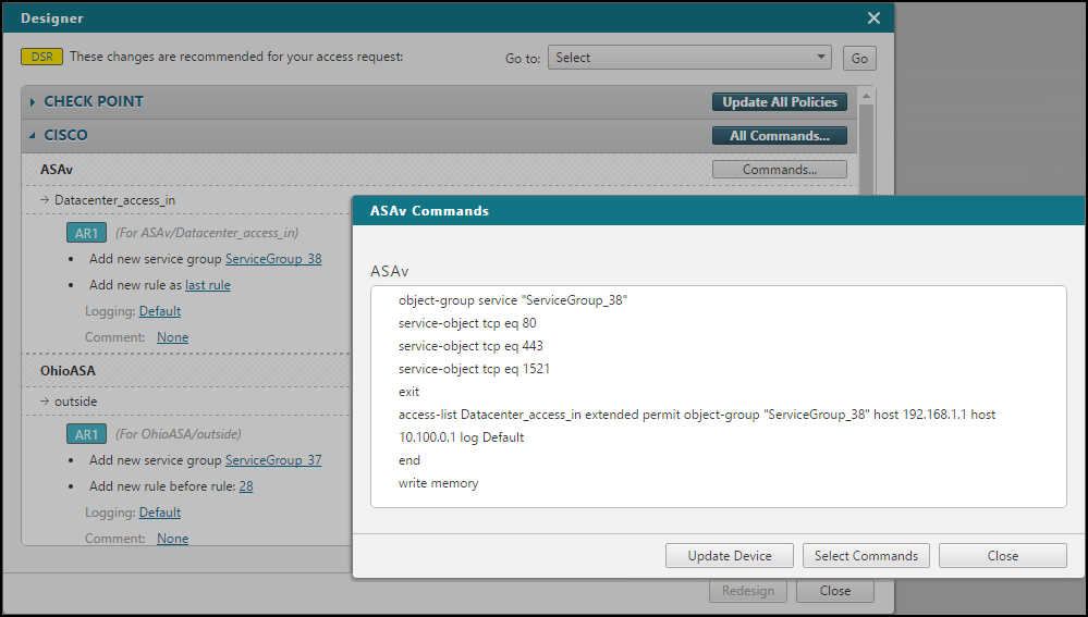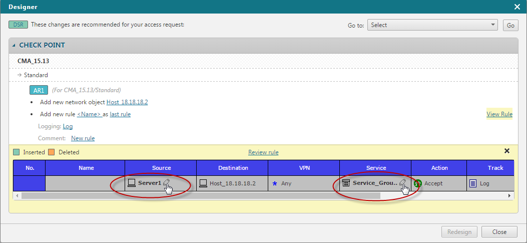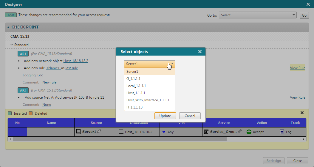 Designer suggests whether to remove or modify rules, or to update network groups, depending on the request.