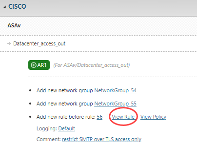 Inline designer view (standard UI): Edit object names, rule names, rule location, or logging. Use View Rule, View Policy, or View AR and related rules as needed.