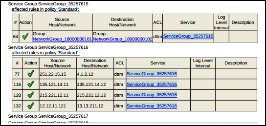 - Groups and members: The report includes the definitions of group objects and their member objects. This is useful for recipients that do not have SecureTrack access. SecureTrack users can click group objects in the report to see the definitions.