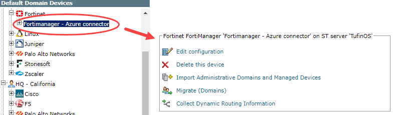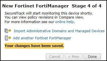 Import the domains and/or devices managed by the Fortinet FortiManager device.