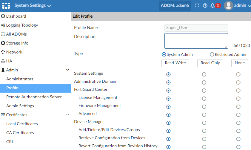 To configure Read/Write permissions for a FortiManager device, in the device user interface: