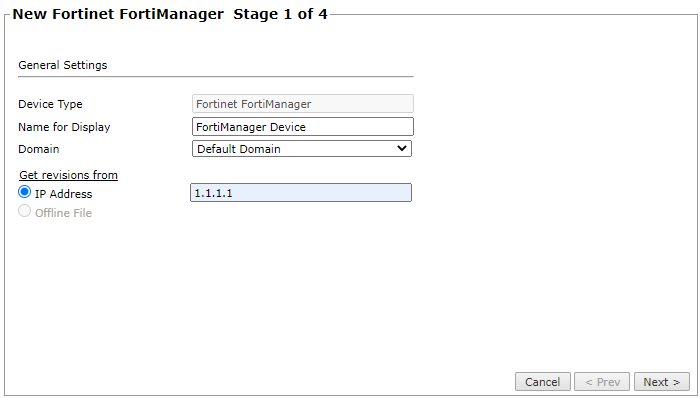 Domain: Available only if you have configured your system for managing multi-domains and All Domains is currently selected. Select the domain to which to add the device. The Domain can only be entered when adding a device; to change the Domain, you must migrate the device.