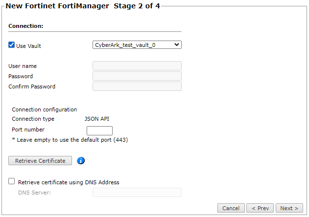 Configure the TOS connection to the FortiManager device, according to the parameters required by the device. To use a vault server that contains access credentials, select Use Vault and select the server. For more information, see Configuring a Vault Server.