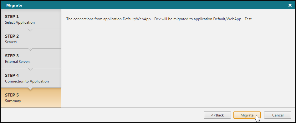 You can migrate connections from existing applications to other applications and select servers in the target applications that replace the servers from the source application. For example, this lets you duplicate the relationships between resources for application deployment in development, testing and production environments.