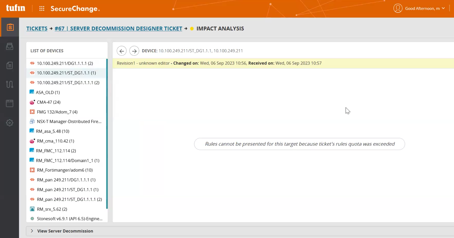 After the first set of rules is processed, you can rerun Impact Analysis, Designer, or Verifier on the same ticket, or create a new decommission ticket to process the remaining rules. The threshold value can be changed with the assistance of Tufin Support.