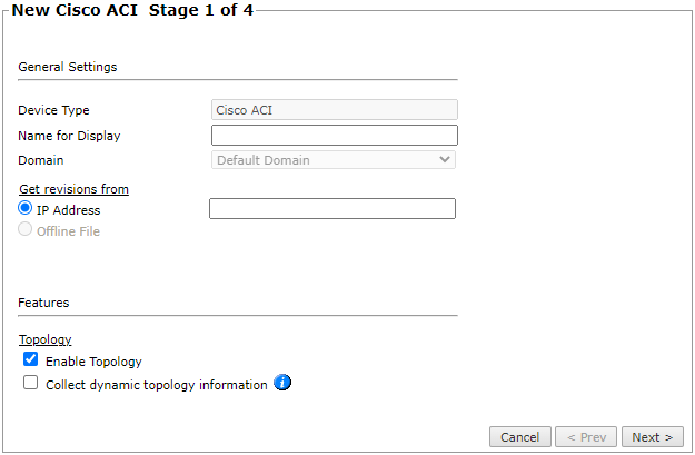 Enter the authentication details needed to connect to the Cisco APIC device. The user must have Read (Read Only, or Read/Write) permissions for all information on the Cisco ACI device.