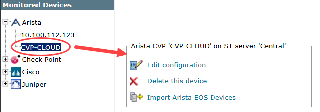 The Arista CVP device now appears in the Monitored Devices list.