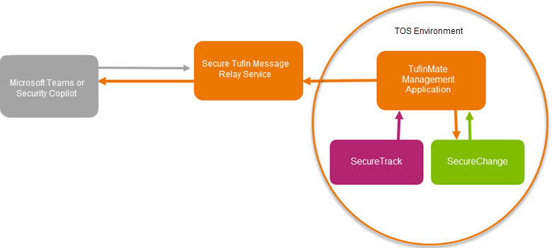 TufinMate is enabled by two cooperative applications. Users dialogue with TufinMate using a plugin installed on Microsoft Teams or enabled in Microsoft Security Copilot. Backend operations are handled by the TufinMate Management Application (TMA) installed on your Tufin cluster along with the other Extensions applications. TMA requires an outbound connection and uses a secure relay service to interface with Teams or Security Copilot in the cloud. All configuration tasks are handled in the TufinMate Management Application.
