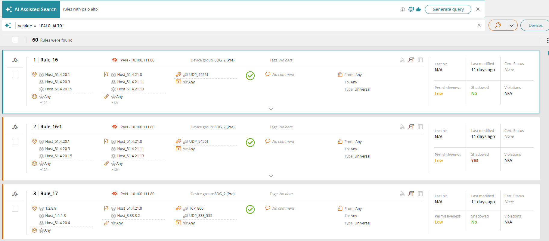 list rules that deny traffic show me all cleanup candidates list all unused rules find all rules with risky ports show me all the rules which have ANY in source and destination show me all rules that are fully shadowed find all devices in PROD domain show me shadowed rules within the last 6 months |
