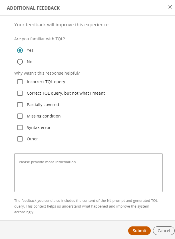 Share feedback with context on how well the generated TQL queries meet your needs. This helps refine the AI Assistant Search experience and enhance its accuracy.
