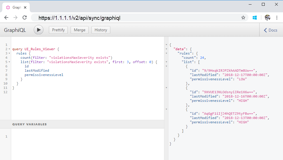 To filter a GraphQL query, enter a TQL filter between double quotation marks ("). For example, the following query is filtered to retrieve rules that have a value in the name field and were last modified in the past 90 days: