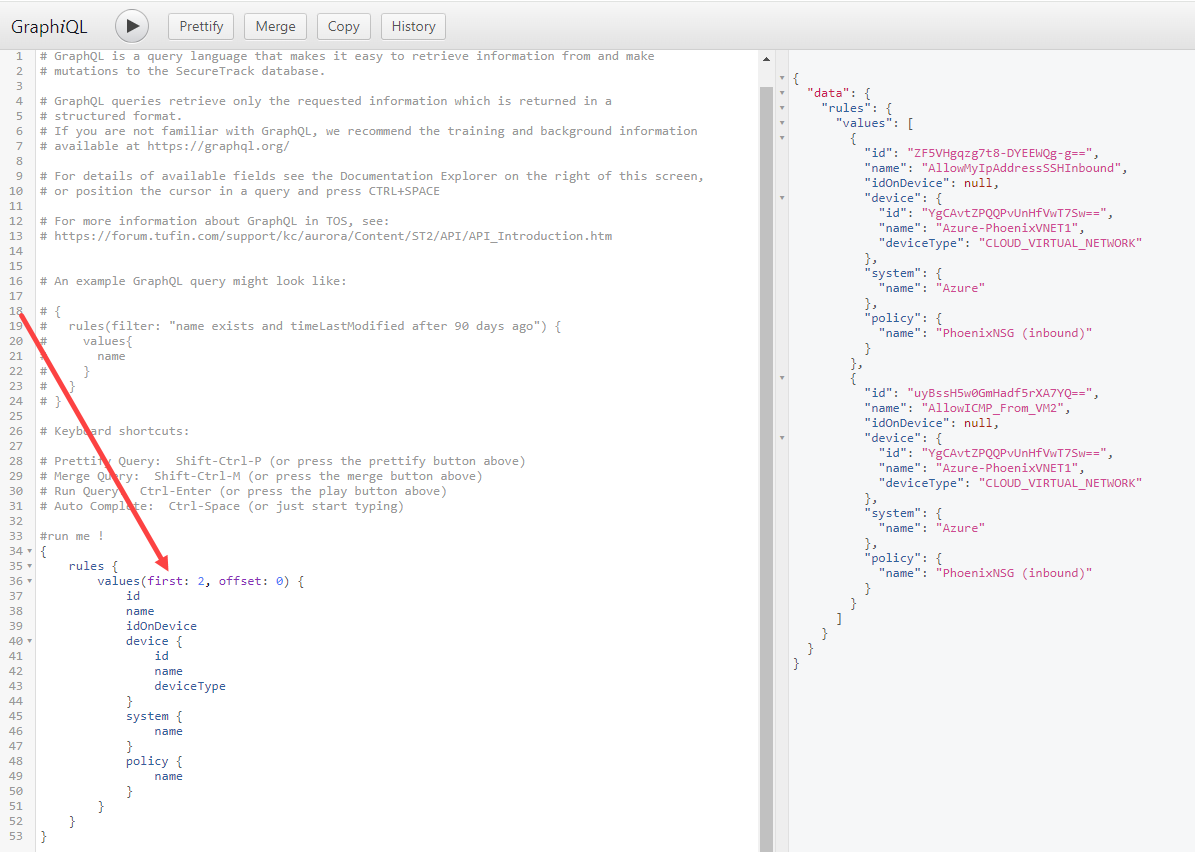 In the example below, first (2), offset (0) returns the first two rules, starting from the first item answering the query condition.