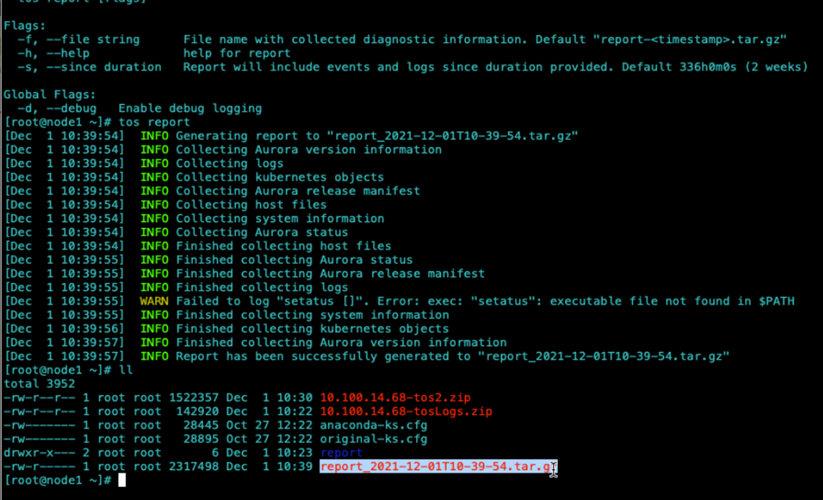 [<ADMIN> ~]$ sudo tos archive create --date=2021-12-31 --path=/tmp Archive completed successfully. Archive file created: /tmp/archive_2021-12-31.tar