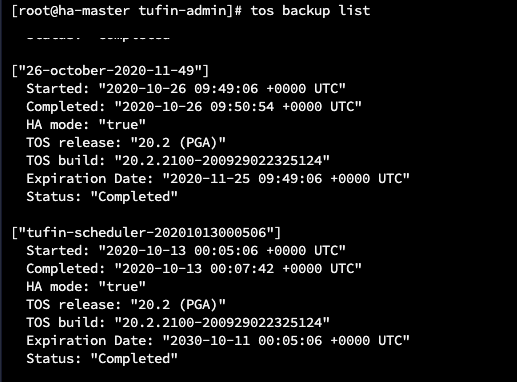 ["16-december-2025-12-4"] Started: "2020-12-16 10:04:14 +0000 UTC" Completed: "2020-12-16 10:05:52 +0000 UTC" Modules: "RC" HA mode: "false" TOS release: "21.1 (PRC1" TOS build: "21.1.1100-201215163002315" Expiration Date: "2021-01-15 10:04:14 +0000 UTC" Status: "Completed" # sudo tos backup list ["23-august-2021-16-18"] Started: "2021-08-23 13:18:43 +0000 UTC" Completed: "N/A" Modules: "ST, SC" HA mode: "false" TOS release: "25.2 (PGA.0.0) Final" TOS build: "21.2.2100-210722164631509" Expiration Date: "2021-09-22 13:18:43 +0000 UTC" Status: "InProgress"