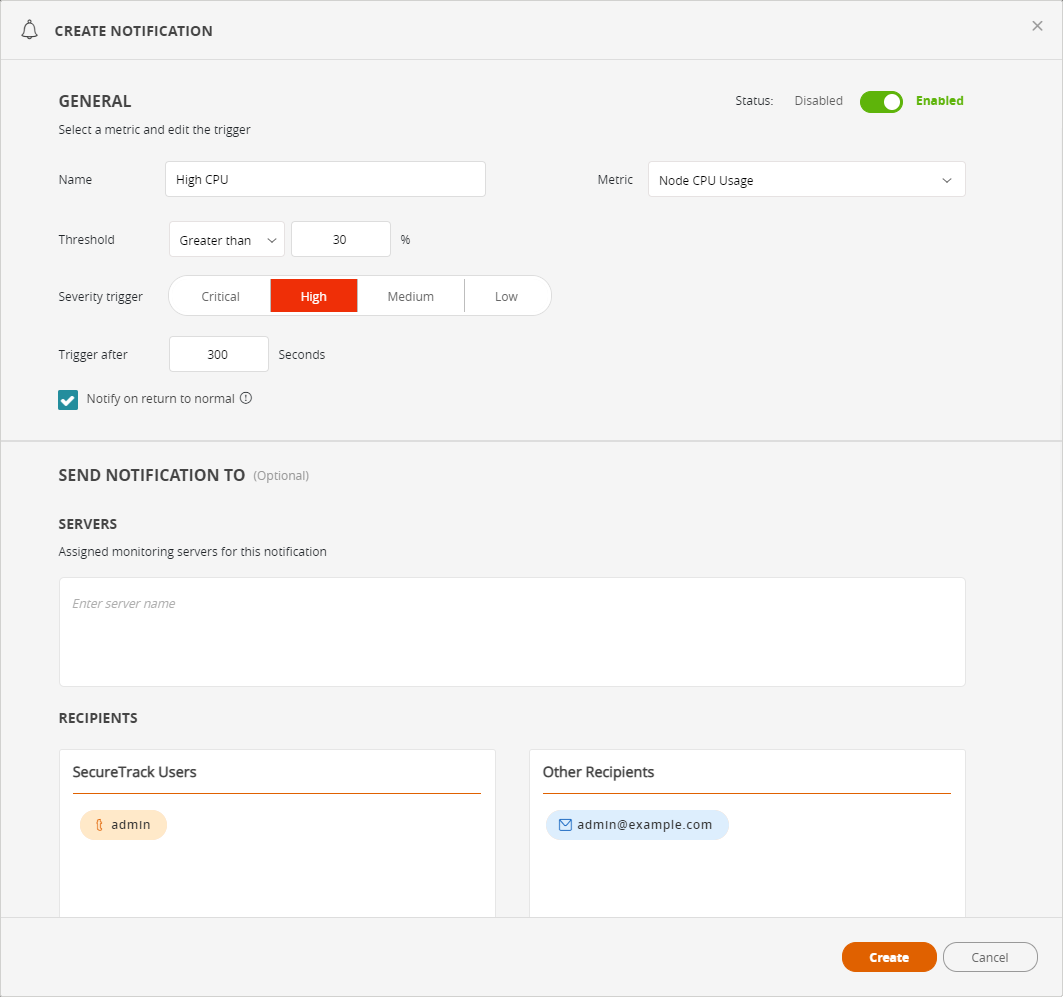 Notify on return to normal: Select this option to have a second notification sent when the metric goes back below the threshold level, or a failure status has been rectified.