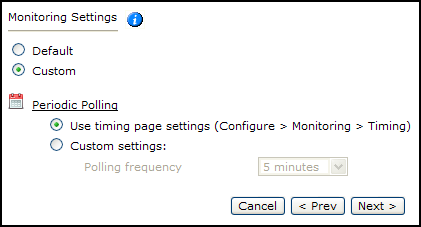 - To define specific timing settings for this device, select Custom, then select Custom settings, and configure the Polling frequency: How often SecureTrack fetches the configuration from each device.