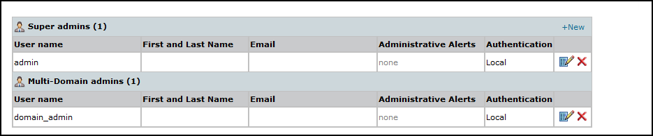 After the first additional (non-default) Domain is defined, existing administrators become Super Administrators and existing users become Multi-Domain Users. The scope of each appears in the following table.