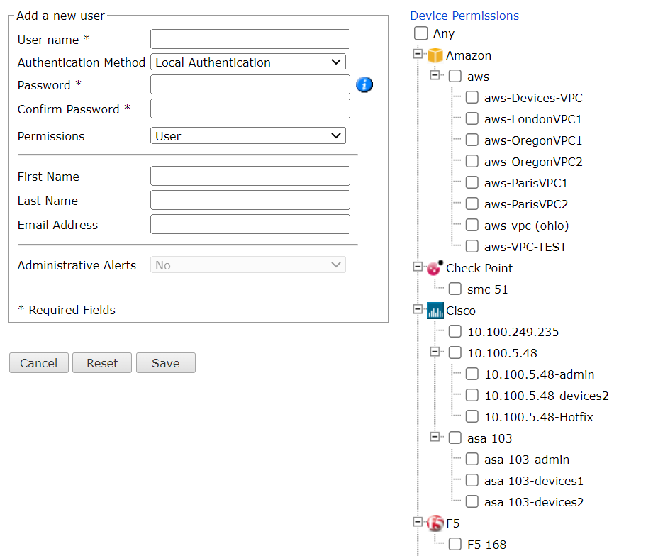 Multi-Domain User: Defined by Super Administrator and given permission for one or more specified monitored devices (group-selectable by Domain, but applies only to currently-configured devices). For these devices, can perform policy management, analysis, auditing, and reporting.