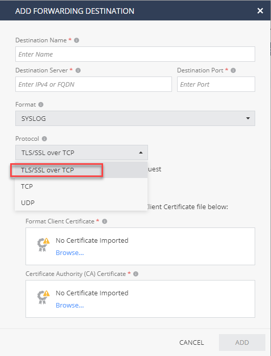 Use the TLS/SSL over TCP or UDP option for the Protocol when defining the Forwarding Destination in Check Point: