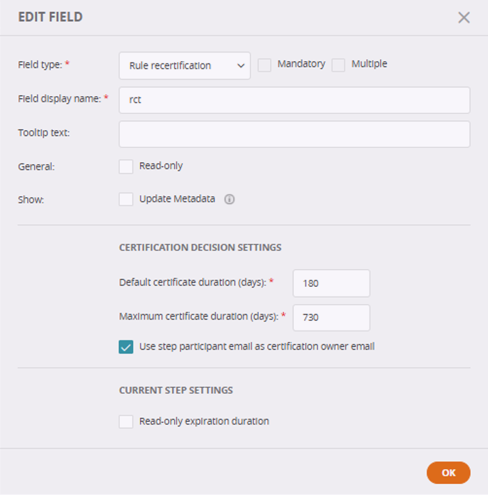The Rule recertification field in a Rule Recertification workflow defines global certification settings for the rule such as the certification duration and certification owner. These settings are inherited by every ticket that uses the workflow, ensuring consistent and reliable certifications.