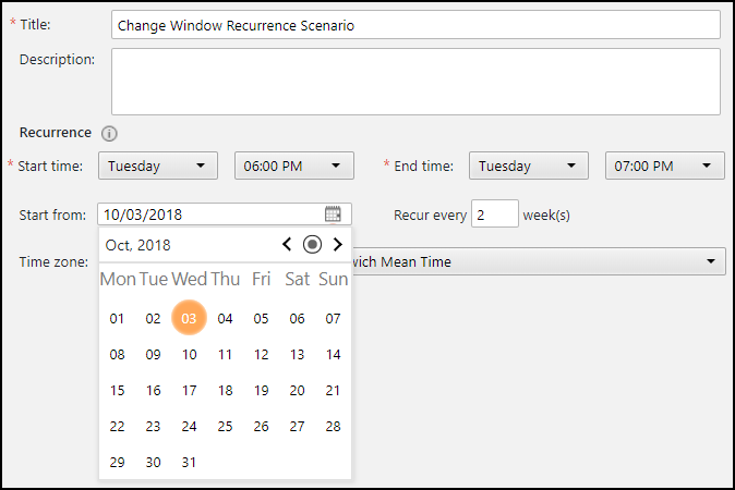 Consider a change window that is configured to start on a day of the week that occurs before the starting date. In the example below, the change window is configured for Tuesdays at 6 pm, beginning October 3rd 2018, and recurring every two weeks: