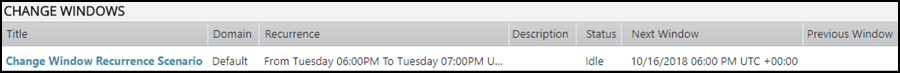 For example, consider a change window that is configured for Fridays at 6 pm, beginning October 3rd 2018, and recurring every three weeks: The change window runs for the first time on Friday, October 5th. The Next Window after that will be Friday, October 26th.