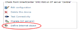 By default, TOS uses the ANY object to represent the all IPv4 addresses in the Internet in TOS features, such as SecureChange Designer. For Check Point and Stonesoft devices, the Internet object can be configured to use a custom object name that you define on the device.