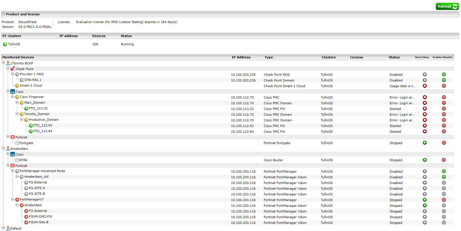The Status page shows the status of each SecureTrack server in each cluster (Central and remote collectors), and the status of each monitored device. This page is available to Administrators only.