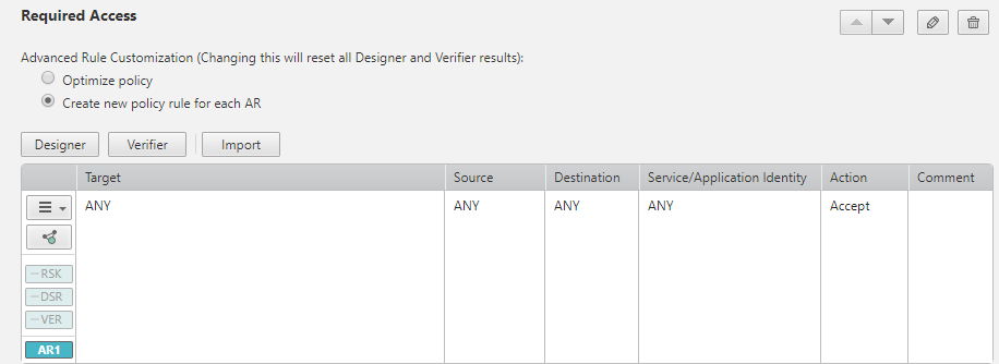 Verifier: The Access Request field includes the Verifier tool, which verifies whether an Access Request has been implemented in actual device policies.