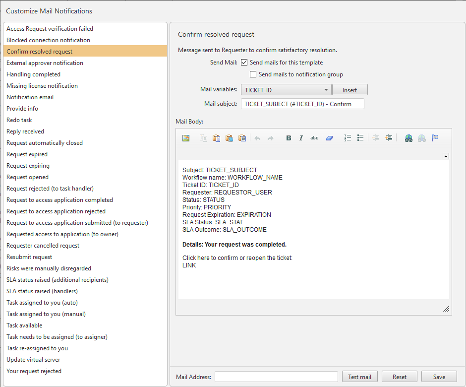 To see an actual email generated with the edited content, type an email address (available only if logged-in user does not have an email address configured in SecureChange) and click Test mail.