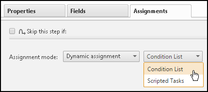 In the Assignments tab in a step, you can select Dynamic assignment and Conditions List to let you configure the conditions that create parallel and conditional tasks. In each row of the conditions list you define the condition that creates a task and you select the method for task assignment.