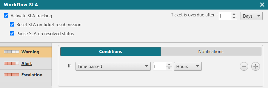 In addition to a total handling time for the workflow's tickets, you configure tracking points for each of three service statuses: Warning, Alert, and Escalation. You also configure recipients of automatic status-change notifications.