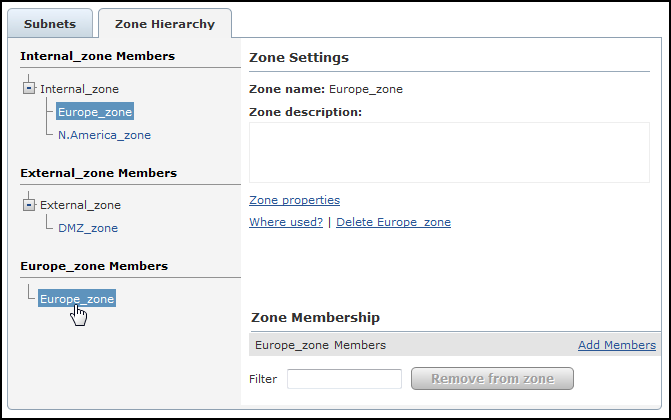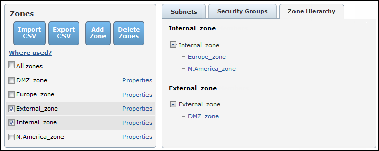 Zones can also include other zones to build a hierarchy. You can view and manage explicit network addresses in the Subnets tab of zones.