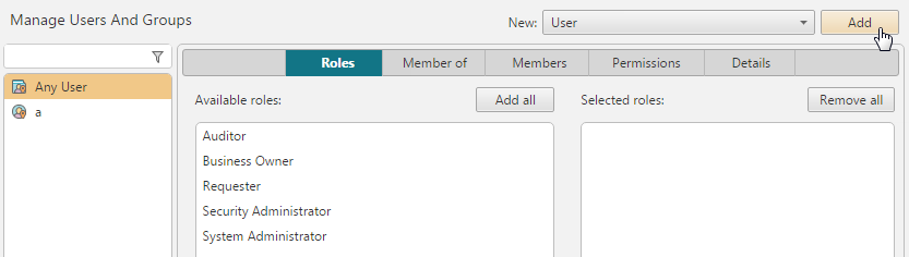 To assign the new user permissions, click the Roles tab and select one or more roles.