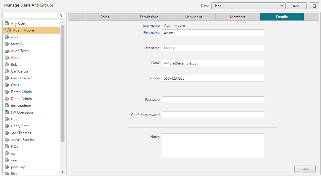 The details of the user or group are shown in the Details tab, where you can also edit the details: