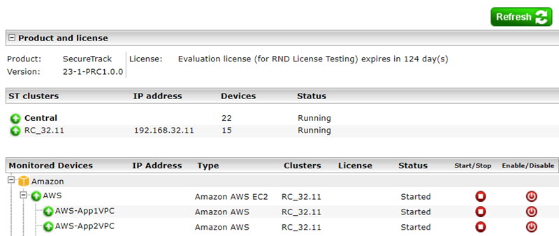 The ST clusters section, lists the number of monitored devices for each SecureTrack cluster. The Monitored Devices section lists the individual monitored devices, and the name of the SecureTrack cluster that monitors them.