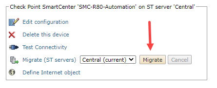 To change which server monitors a device, first migrate the device to the Central Cluster server (see above), and then migrate to the target Remote Collector (RC) server.