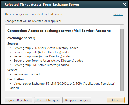 Review the changes that were requested in the ticket and click Reason to see the reason for the rejection.