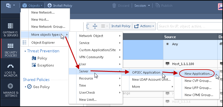 - In the Objects menu, select: More object types > Server > OPSEC Application > New Application