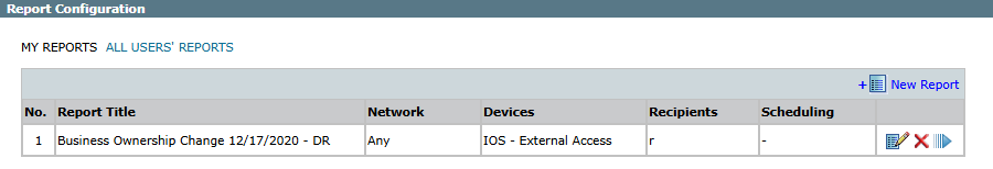 Business Ownership change reports are scheduled reports that contain information on changes made to access control for a specified network segment, within a specified span of time. These reports can be valuable for administrators who are responsible for, or own, those network segments.