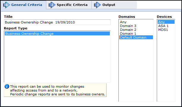 If you selected more than one domain, then Any is selected for Devices, and all devices in the selected domains are included in the report.