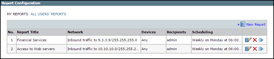 A list of configured reports, available for the connected user, appears. Each line in the table displays basic information for one report: the report's title, type, relevant devices, recipients, and scheduling.