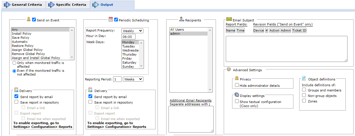 - Show textual configuration (Cisco only) (when ticket ID recognition is configured): If selected, the rule Name and Comment fields are removed from the report results. Only the ticket ID is included. This is useful if ticket comments contain confidential information that should not be sent to report recipients, such as administrator details.